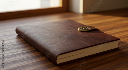 温かい日差し浴びる革製ノート 上品な質感 手作り感漂う This translates roughly to: "Leather notebook basking in warm sunlight. Elegant texture. Handcrafted feel.". AI Generated