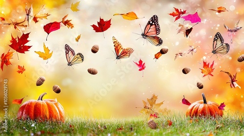 A field brimming with hordes of orange-yellow butterflies soaring above an orchard of orange-yellow foliage