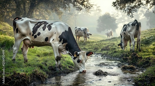 A group of cows grazes peacefully in a verdant pasture near a babbling brook
