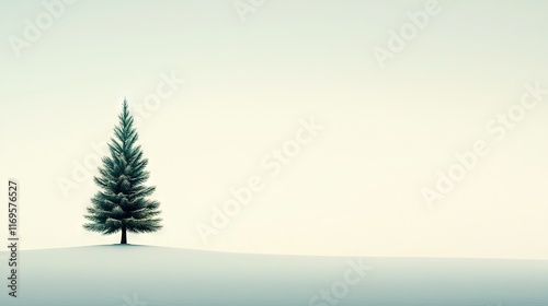 A lone pine tree stands tall amidst a snow-covered field, framed by a hazy sky above