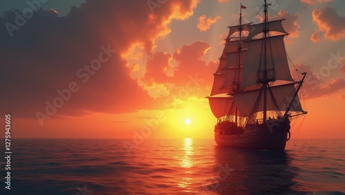 A serene pirate vessel glides towards a vibrant sunset, its intricate details visible against the stunningly colorful sky., ultra detailed, 8k resolution, HDR, professional