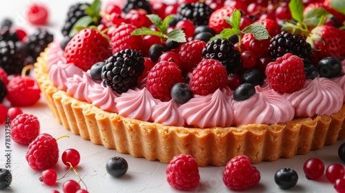 A tart topped with raspberries and blueberries on a pristine white surface