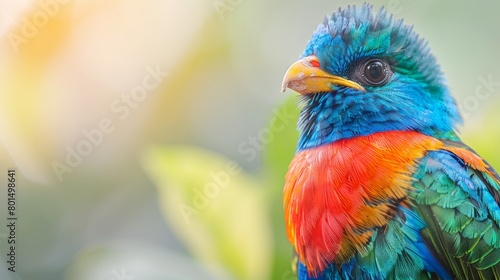 A vibrant bird perched on a verdant branch against a softly blurred green backdrop
