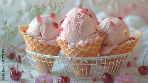 A wire basket with three scoops of ice cream and cherries surrounds it on a white tablecloth