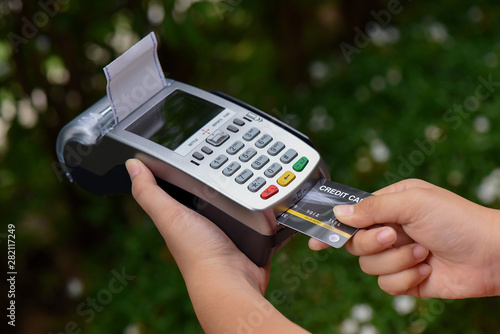Credit card payment concept. close-up hand insert credit card mock up with blank card with a card swipe machine
