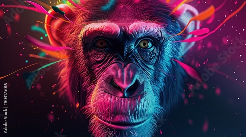 Monkey face in colorful paint splatters, close-up