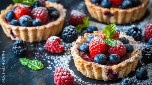 Tarts topped with berries , mint, and powdered sugar on a black background