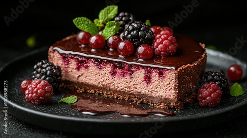 A chocolate cake with raspberries and blackberries on top on a black plate, garnished with fresh mint leaves