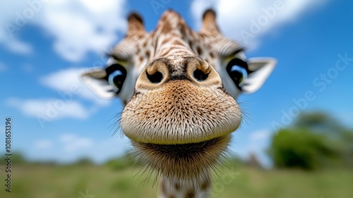 A close up of a giraffe's face with a blue sky in the background