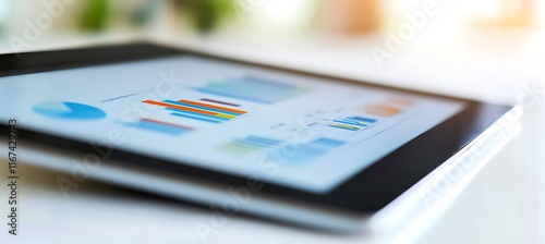 A close-up of a business strategy document on a digital tablet, with colorful charts and graphs, set against a clean white background