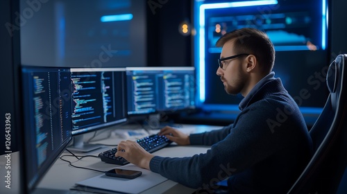 A focused male tech worker sitting at a sleek workstation, typing on a futuristic keyboard with multiple monitors displaying lines of code and cybersecurity analytics