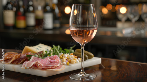 A glass of rosé wine accompanied by a cheese platter, set against a backdrop of a cozy bar, perfect for a relaxed evening.