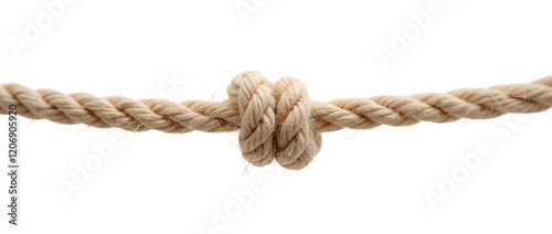 a length of thick, natural fiber rope tied in a knot. The rope is light brown in color, showcasing its texture with visible twists and strands.