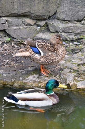 A pair of ducks -mallard on the park pond. Male is swimming, female duck is standing on the stone. Wild birds outdoors photo .Close up photo