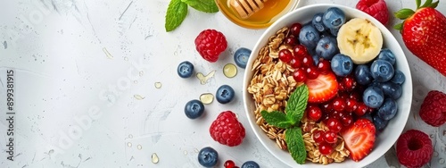 A pristine white table holds a beautifully arranged bowl of granola topped with vibrant red strawberries, blueberries, and raspberries Drizzled with golden honey