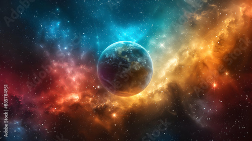 A solar planet surrounded by colorful cosmic dust and twinkling stars