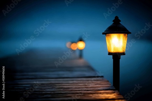a street light sitting atop a wooden dock at night, with a blurred background The light is illuminated, casting a warm glow on the dock and the surrounding area
