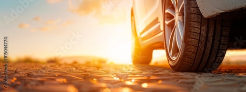 A tight shot of a car tire on the road, sunrays filtering through overlapping clouds behind