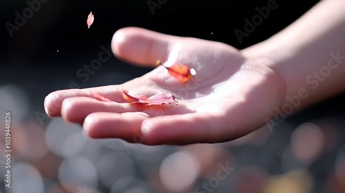 A tight shot of a hand holding a flower in the palms center