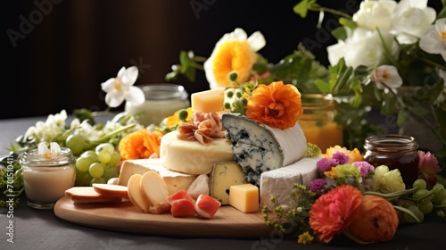 a variety of cheeses on a cutting board with flowers and jars of honey on the side of the table.