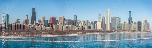 Aerial Panorama of the Chicago Skyline Along Lake Michigan in Winter on January 23, 2026