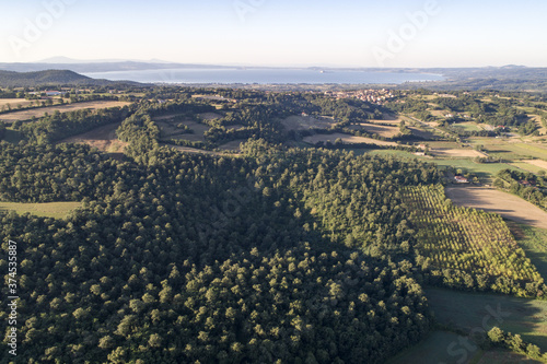 Aerial view of sunflower fields in Bolsena. In Viterbo