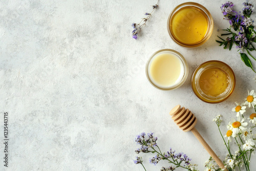 honey, wildflower, chamomile, organic food, healthy eating, floral arrangement, light background, food photography, alternative medicine, apiculture, healthy lifestyle, topview, honey pot, cooking ingredient