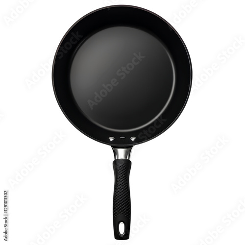 Black non-stick frying pan with long textured handle, isolated on transparent background PNG