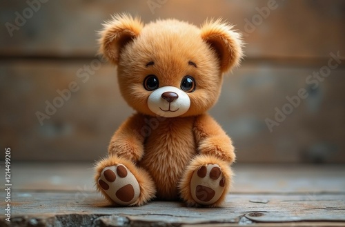 Brown teddy bear sitting alone on a wooden surface against a blurred background with his hands down created