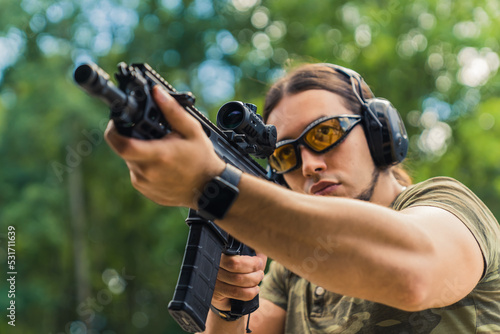 Caucasian man with protective eyeglasses and headphones practicing with a black rifle at the shooting range, medium closeup. High quality photo