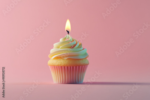 Celebratory Cupcake with Single Sparkling Candle on White Surface