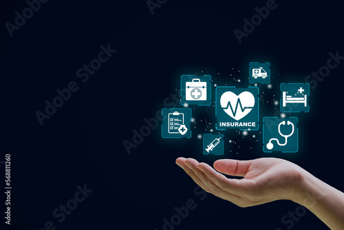 Close up hand with healthcare medical icon.Health insurance concept.Copy space.