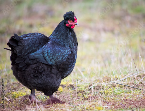 Close up of black chicken on a farm in nature. Hen in a free throw farm. Hen walk in the yard of the farm. The concept of rural life. Agriculture. Country life