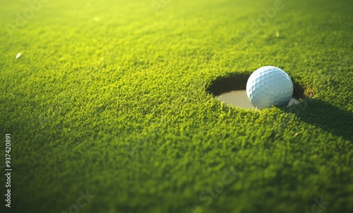 Close-Up of a Golf Ball Near the Hole on Green Grass with Ample Copy Space for Summer Sports and Relaxation Concepts