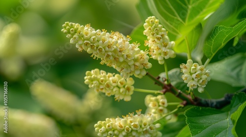 : Close-up of mulberry blossoms, showing their small, intricate flowers against a background of lush, green foliage,