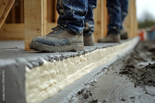 Construction worker's boots standing on foam insulation along a building's foundation, representing the importance of structural support and insulation.