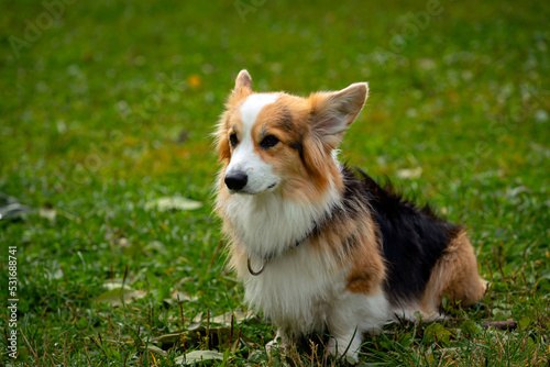 Corgi dog on a green field. Close-up