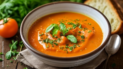 bowl, bread, tablecloth, fresh, carrot, soup, dining, appetising, tomatoes, orange, basil, meal, food, herb, table, garnish, kitchen, healthy, spoon, delicious