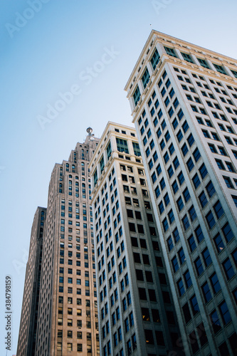 detroit, building, skyscraper, art deco, downtown, city, office, business, sky, tall, urban, building, tower, blue, glasses, skyline, high, business building, exterior, city landscape, corporate, window, structure, window, michigan, us, america, highrise, blue skies