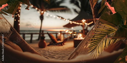 evening on the beach at sea luxury resort candles burn on the tables of a beach cafe, hammock with cozy pillows ,tropical plant and flowers holiday vacation travel background,generated ai