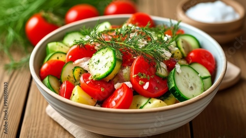 bowl, fresh, olive oil, colourful, summer, vegetable, tomatoes, feta, ripe, herb, alimentary, wooden table, garnish, mediterranean, dill, healthy, salad, parsley, cucumber