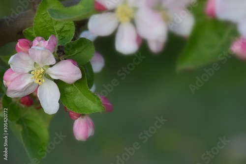 Fruit tree blossoms in the garden, floral background for writing notes on