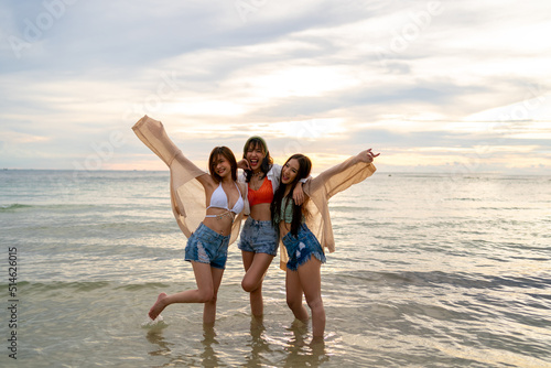 Group of Young Asian woman in walking and playing together on tropical beach at summer sunset. Happy female friends enjoy and fun outdoor activity lifestyle on holiday travel vacation at the sea