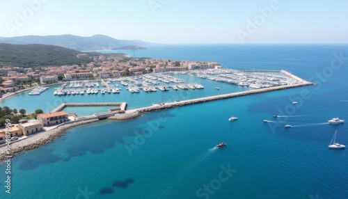 Idyllic marina with vibrant blue waters and bustling boats