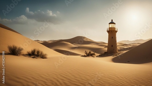 in the desert A fantasy lighthouse in a desert oasis, with sand, palms, . The lighthouse is made of clay
