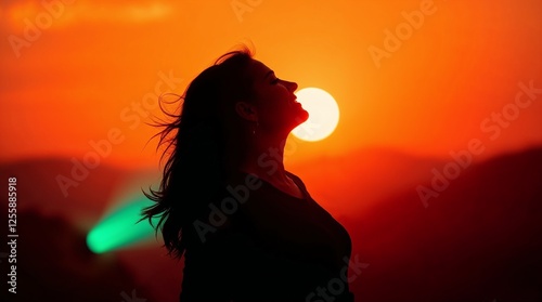 Intense dramatic lighting, warm terracotta and cool teal. Silhouette of a woman celebrating at sunset.