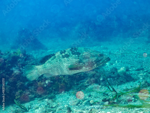 高級魚。 クエ, Longtooth grouper, Epinephelus bruneus, ハタ科, 他の群れ。 ヒリゾ浜南伊豆町中木 静岡県伊豆半島-2025 日本有数のシュノーケリングスポット。 夏の数カ月間だけ渡し船で行ける。 水質透明度魚影が素晴らしい。