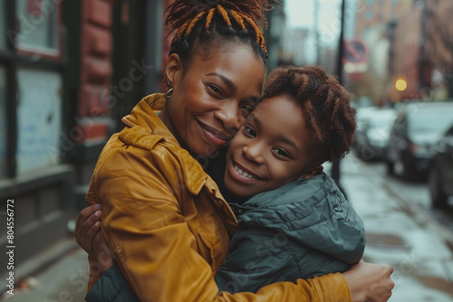 Mother's Day Concept. Portrait of happy African American mom hugging her cute little daughter, on the street.