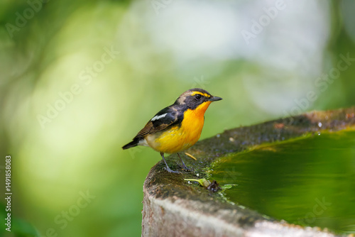 泉で水浴びをする可愛いキビタキ(ヒタキ科) 英名学名:Narcissus Flycatcher (Ficedula narcissina) (family comprising the flycatchers) 秦野駅近くにある弘法山公園は、浅間山、権現山、弘法山を含む神奈川県立の自然公園。 山頂には野鳥の観察施設「バードサンクチュアリ」がある 神奈川県秦野市- 2025年