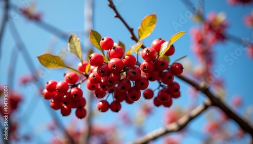 flora, flora, wild fruit, horticulture, tree branch, nature scene, organic, closeup, fruit tree, sunlight, natural beauty, blue skies, springtime, red berry, tree leaf